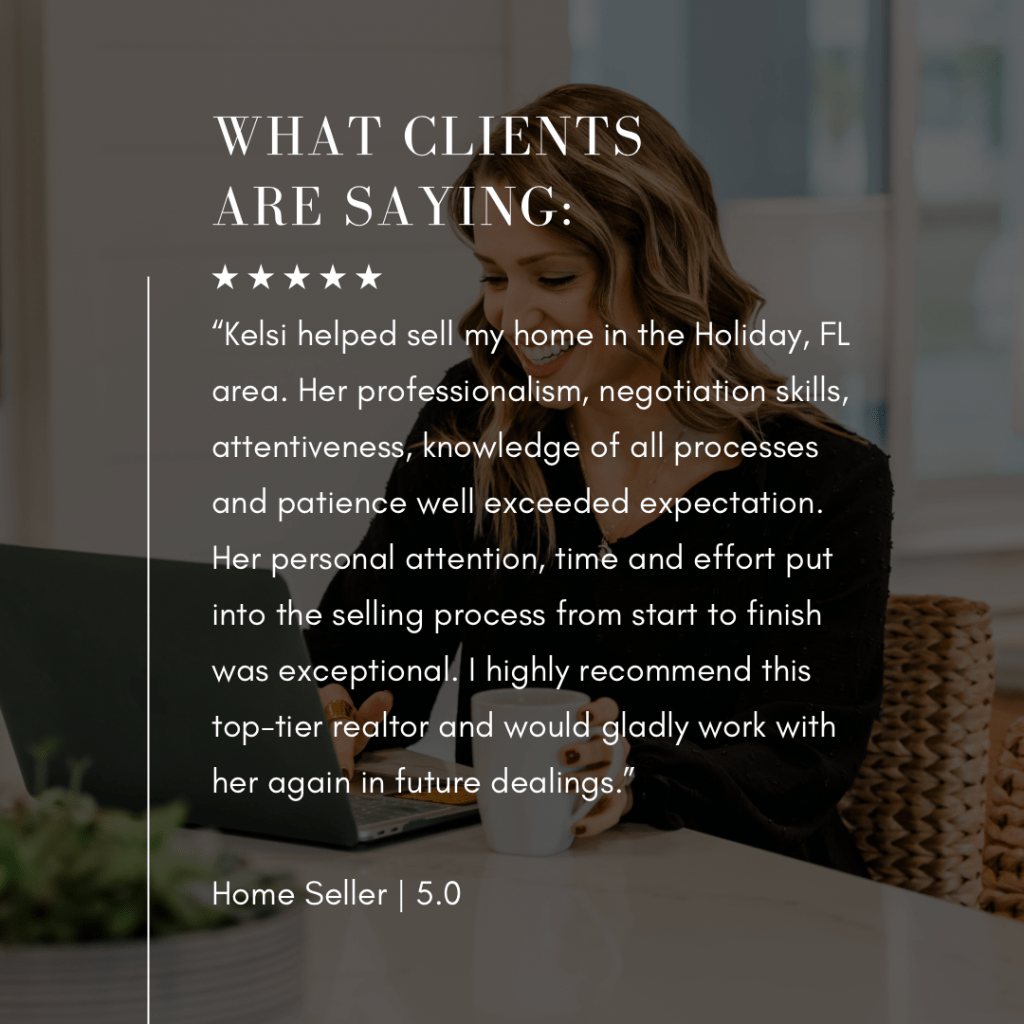 Kelsi helped sell my home in the Holiday, FL area. Her professionalism, negotiation skills, attentiveness, knowledge of all processes and patience well exceeded expectation. Her personal attention, time and effort put into the selling process from start to finish was exceptional. I highly recommend this top-tier realtor and would gladly work with her again in future dealings.